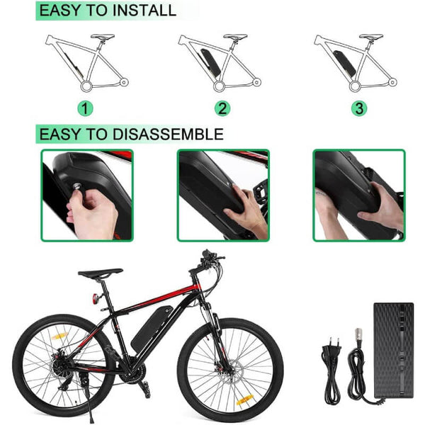 - Ergonomic Design and Widely Applicable: The electric bike battery pack has a mounting bracket that will mount to most water bottle screw holes in the frame. Compatible with 36V electric bikes, bicycles, mountain bikes and more.