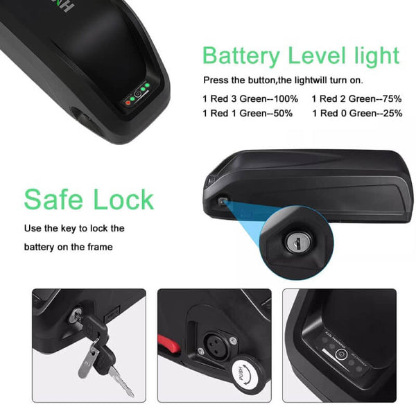 - User-friendly Design: The light-weight design makes the battery easy to install and remove. Black hard plastic shell protects the battery effectively and LED battery level indicator can inform you of charging in time. Equipped with battery holder, just need to use the key to open the safe lock.